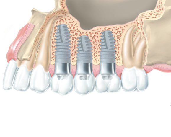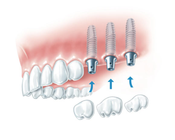 3 Una vez concluida esta fase, se colocan la coronas o los puentes permanentes de forma duradera sobre los implantes.