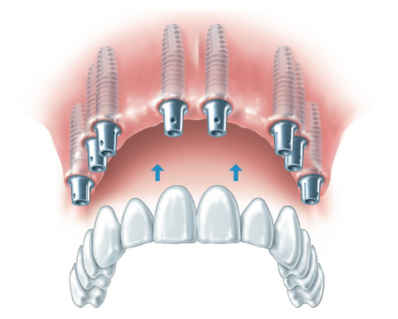 En algunos casos de desdentados totales no es necesario poner tantos implantes como dientes faltan, sino que se puede colocar un número de implantes menor, para la rehabilitación de toda la arcada.