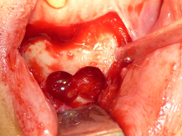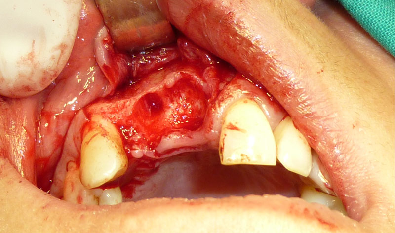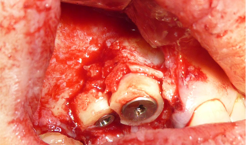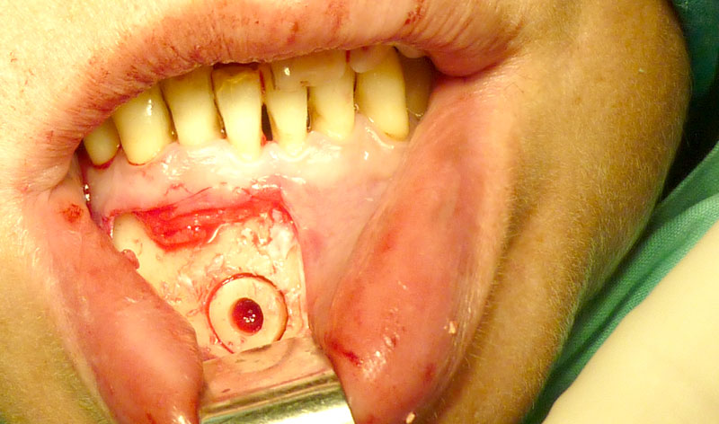 La técnica comienza extrayendo el injerto con trefina, mediante una perforación en el centro, que tiene el mismo tamaño del diámetro del implante extraído y se fija a la zona receptora con el implante Xive (Densply).